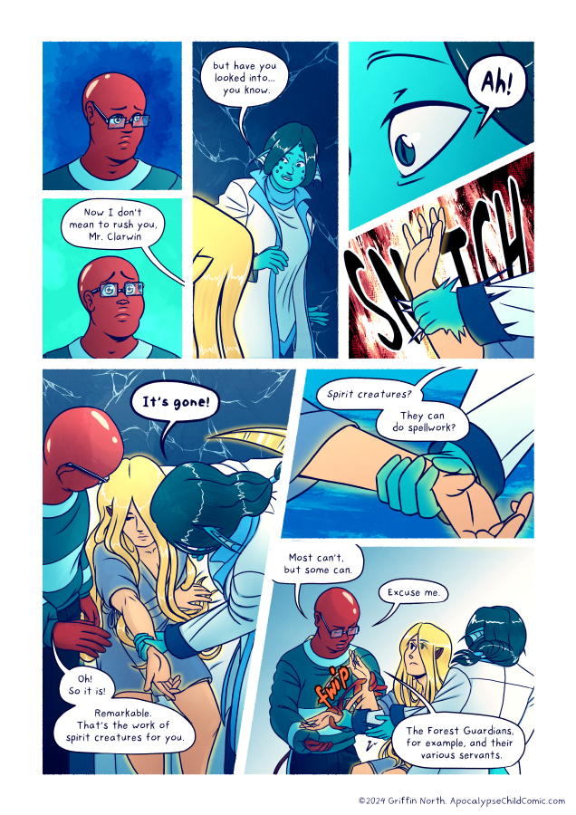 Doctor: Spirit creatures? They can do spellwork? [She’s still holding the boy’s arm.]